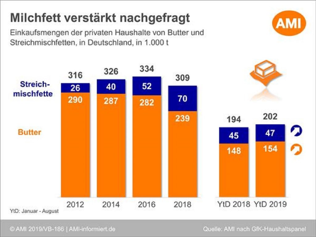 Im Jahr 2018 blieb die Einkaufsmenge der privaten Haushalte in Deutschland an Butter – nach Analysen der AMI auf Basis des GfK-Haushaltspanels – in der Summe noch um knapp 8 % unter der des Vorjahres. Dabei resultierten 70 % der Einbußen im Vorjahresvergleich aus dem ersten Halbjahr, das von großen Preisabständen geprägt war. Hingegen zeichnen die Daten der ersten acht Monate des Jahres 2019 ein überraschend positives Bild. Die Nachfrage nach Butter hat um 4,1 % zugelegt. Auch Streichmischfette konnten ihren Anstieg fortsetzen und um 4,7 % höhere Einkaufsmengen verzeichnen als im gleichen Zeitraum des Vorjahres. Hierzu haben im Wesentlichen die nachgebenden Preise in beiden Segmenten beigetragen. Ein deutlicher Preisabstand zum entsprechenden Vorjahreszeitraum hat sich allerdings erst ab Mai dieses Jahres aufgetan. Mit 1,39 EUR haben die deutschen Verbraucher im Juni 2019 für ein 250-g Päckchen Deutsche Markenbutter 50 Ct weniger gezahlt als ein Jahr zuvor, für Handelsmarken bei den Streichmischfetten immerhin 40 Ct.