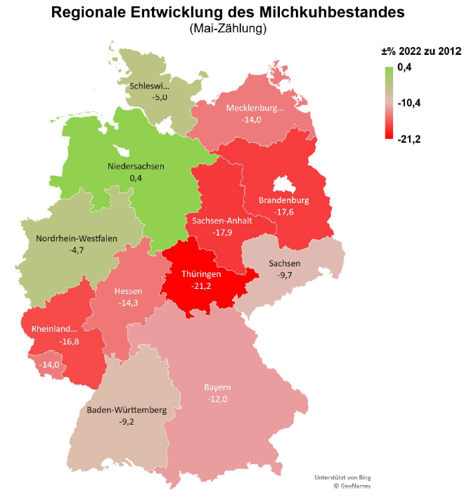 In allen Bundesländern sind die Kuhzahlen gesunken. Wie auch in den Vorjahren war die Entwicklung aber regional unterschiedlich. Am wenigsten ausgeprägt war der Abbau im Vergleich zum Vorjahreszeit in Niedersachsen (-1,0%) sowie im Saarland (-0,7%). In Bayern, wo weiterhin die meisten Kühe gehalten werden, wurde eine Einschränkung um 1,8 % registriert. In den neuen Bundesländern waren die Abstockungen mit 3,2 % innerhalb von zwölf Monaten stärker ausgeprägt als im ehemaligen Bundesgebiet mit 1,6 %. In den alten Bundesländern wurden die Kuhbestände in Rheinland-Pfalz und Hessen um 2,6 % bzw. 2,4 % am stärksten reduziert. Die Entwicklung, dass die Milchkuhhaltung aus der Mitte abwandert und sich stärker in den Nord-Westen, aber auch Teile des Südens verlagert, ist bereits längerfristig festzustellen, wie die Kartenansicht zeigt.