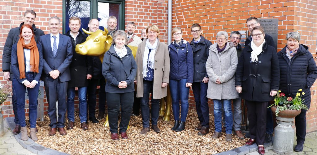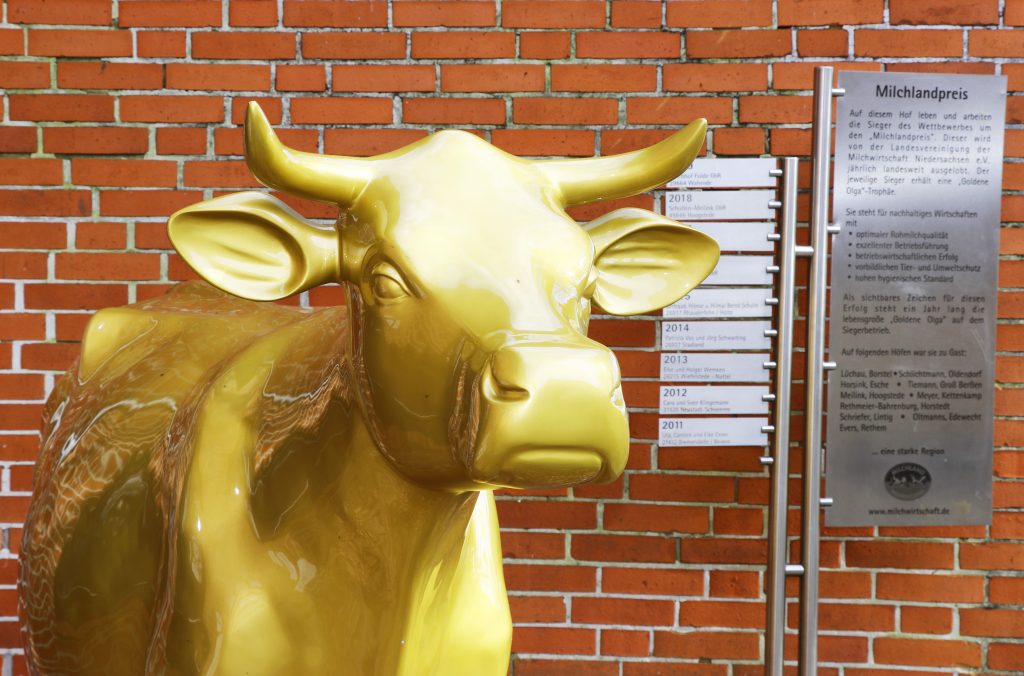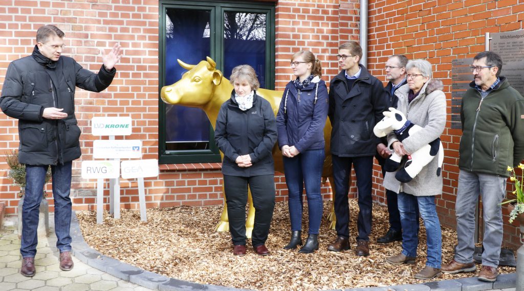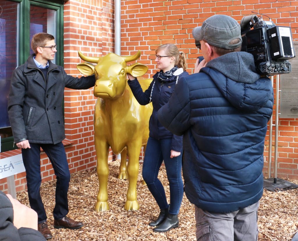 Die goldene Kuh-Statue steht jetzt ein Jahr lang auf der Milchhof Fulde GbR. Die Familien Bergmann und Harms aus Walsrode-Fulde haben den Milchlandpreis 2019 für nachhaltiges Wirtschaften gewonnen. Fernsehsender, Zeitungen, Politiker und Gratulanten waren beim Aufstellen der Goldenen Olga dabei.