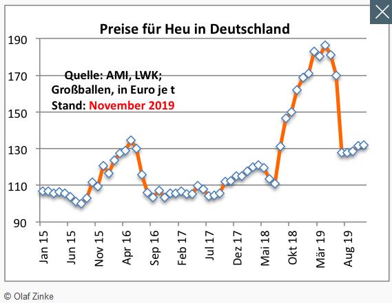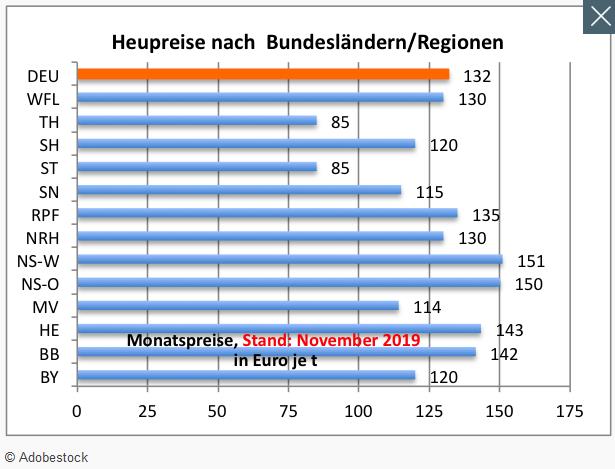 Heupreise von 142 Euro meldete man im Oktober aus Brandenburg. Im Vergleich zum vorigen Monat sind dies unveränderte Preise. Allerdings müssen in Brandenburg die mit Abstand höchsten Heupreise aller ostdeutschen Länder gezahlt werden. Die Heupreise in Hessen lagen für den Großballen bei 143 Euro je t und damit ebenfalls so hoch wie im Vormonat. Die Preismeldungen aus Rheinland-Pfalz waren mit 135 Euro je t Heu ebenfalls stabil. Rund 130 Euro je Tonne müssen die Landwirte weiterhin im Kammergebiet Westfalen zahlen.