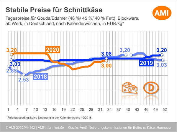 Die Bestandssituation in den Reifelägern wurde von den Werken als vergleichsweise jung eingestuft. Die Preise für Schnittkäse bewegten sich in der Berichtswoche zumeist auf dem Niveau der Vorwoche. Die Notierungskommission in Hannover setzte für Blockware eine mit 2,90 bis 3,10 EUR/kg unveränderte Spanne fest. Die Notierung für Brotware wurde am oberen Ende um 5 Ct auf 2,95 bis 3,25 EUR/kg hochgesetzt.