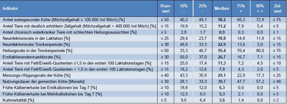 Die Betriebe werden für den für sie berechneten Indikator nach Perzentilen eingeteilt. Hierbei werden dem Indikatorwert nach alle Betriebe in 100 umfangsgleiche Teile zerlegt; d.h., jedes der 100 Perzentile enthält gleich viele Betriebe. So ist der Median der Indikatorwert, bei dem 50% der Betrieb darüber- bzw. darunterliegen. In dem nationalen Monitoring sind weiterhin für jeden Indikator die Grenzwerte für „++“ (90% Perzentil), „+“ (75% Perzentil), „-“ (25% Perzentil) und „–“ (10% Perzentil) angegeben. Das 90% Perzentil ist z. B. der Wert, den die 10% der „stärksten Betriebe“ überschreiten und das 25% Perzentil der Wert, den die 25% der „schwächsten Betriebe“ nicht erreichen.
